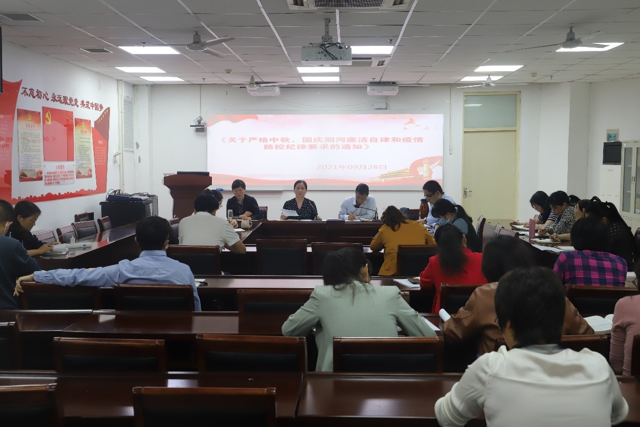 为深入贯彻落实习近平总书记“七一”重要讲话和中央、省委关于全面从严治党及做好疫情防控相关指示批示精神,驰而不息纠“四风”、树新风,2021年9月28日下午在BM739会议室,科学院党总支召开2021年中秋、国庆双节廉洁自律专题会,科学院党总支委员、各支部书记、业务主任和全体办公室人员参加会议。会议由副院长杨文胜主持。
