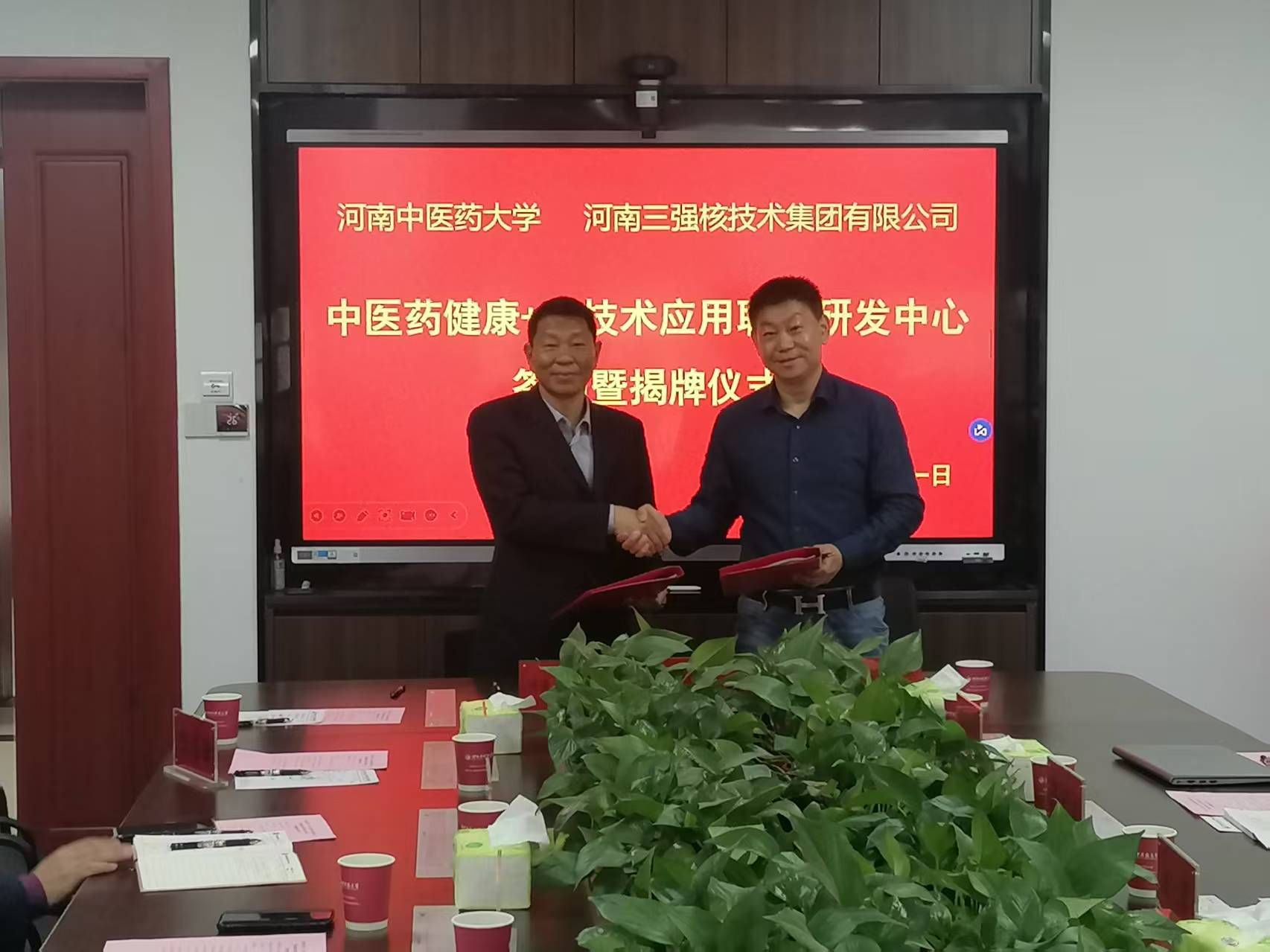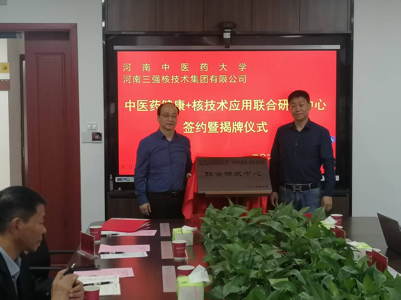 在与会人员的共同见证下,张振强与朱军签署了共建“电影先生 ●河南三强核技术集团有限公司中医药健康+核技术应用联合研发中心”合作协议,李东阳与朱军共同为校企联合研发中心揭牌。双方围绕下一步的科研合作方向如中药材质量提质增效、核医学装备研发等进行了座谈交流。朱军一行还参观了学校中医药博物馆和豫药全产业链河南省协同创新中心等。
