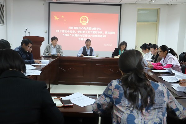 为进一步贯彻校纪委《关于落实中纪委、省纪委<关于紧盯中秋、国庆期间“四风”问题的电话通知>精神的通知》的部署和有关要求,2018年9月26日上午9:00在教学综合大楼BM739会议室,科研实验中心与实验动物中心直属党支部召开中心组(扩大)专题学习会,中心处级干部、各实验室主任参加会议。支部纪委书记李军主持会议。