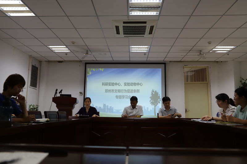 为提升师生素质,促进文明养成, 2018年9月2日下午,科研实验中心与实验动物中心郑州市文明行为促进条例专题学习会在BM739举行。中心主任张振强,副主任李军、杨文胜,中心全体教职工参加此次会议。会议由副主任杨文胜主持。