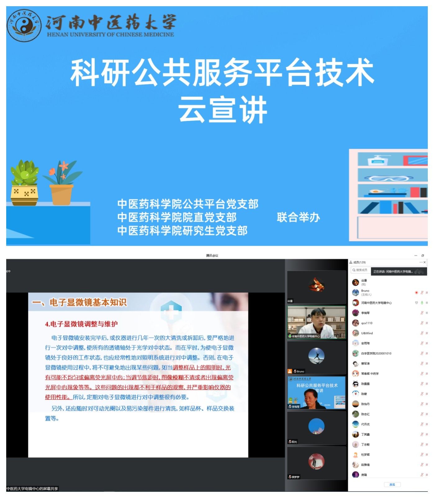 本网讯(文/ 张俊霞 图/谷康 张飞宇)为深入学习贯彻党的二十大精神,贯彻落实习近平总书记视察河南重要讲话精神,扎实高效开展能力作风建设年活动,切实提升公共平台大型仪器使用效率,提高科研人员技能素养,由电影先生 公共平台党支部发起“凝心聚力做服务,全心全意为科研”倡议,联合电影先生 院直党支部、研究生党支部共同举办的“科研公共服务平台技术云宣讲”活动于2022年10月31日晚7点正式开讲了!