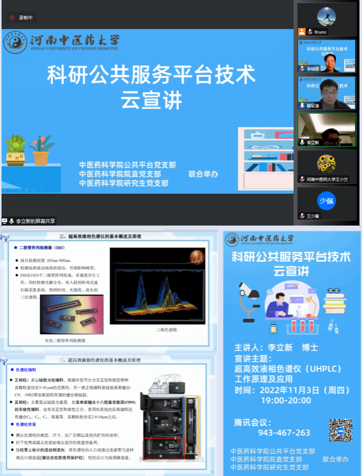 本网讯(文/张俊霞 图/张飞宇)为切实提高科研人员技能素养,电影先生 发起“凝心聚力做服务,全心全意为科研”倡议,举办“科研公共服务平台技术云宣讲”系列活动。第二期宣讲于2022年11月3日晚7点线上举行。本期邀请校仲景青年学者A类人才李立新博士作题为“超高效液相色谱仪(UHPLC)工作原理及应用”的技术宣讲。