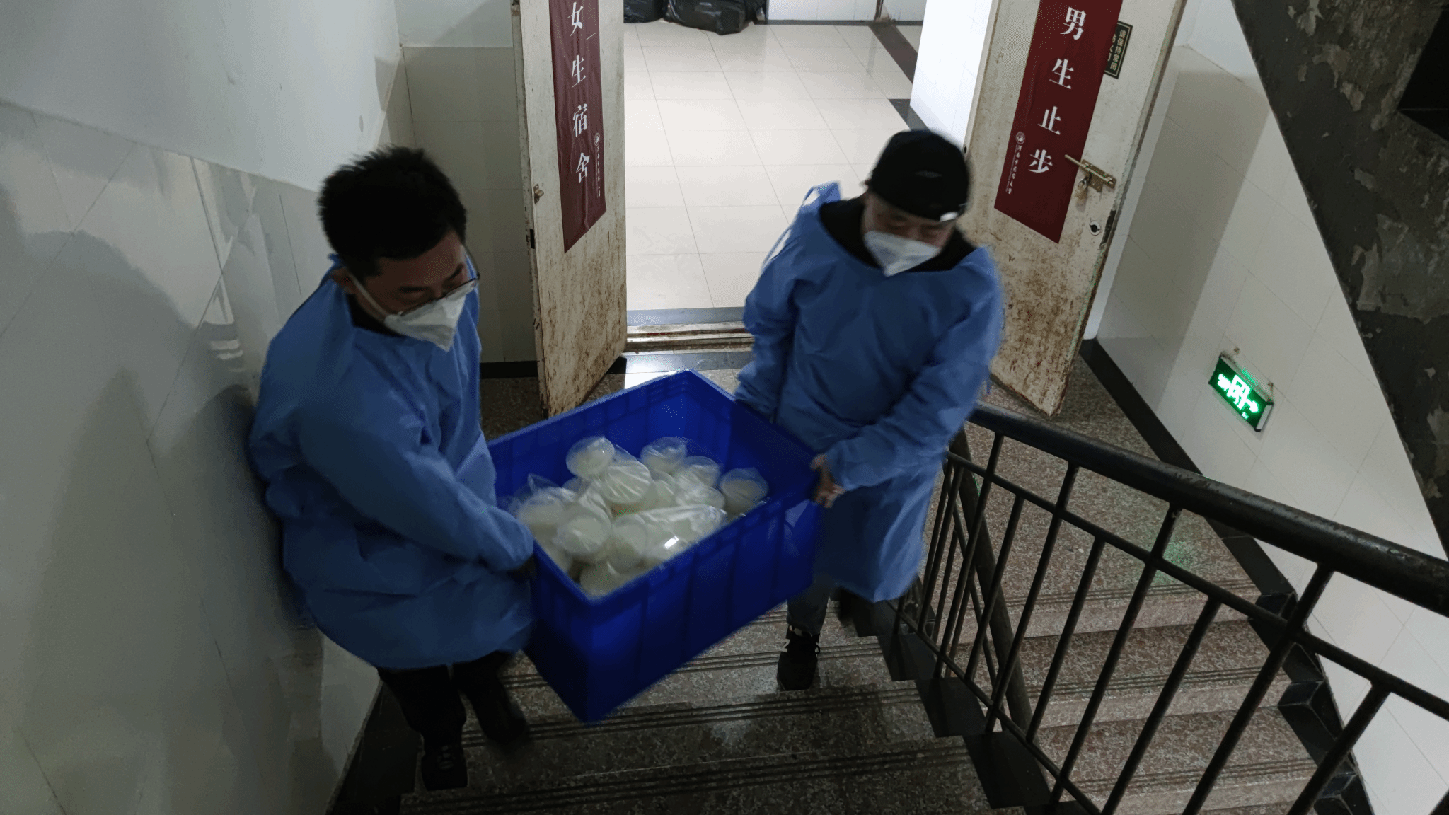 11月10日下午,疫情防控形势升级,学生开始静默管理,学校组织教师志愿者队伍为学生们送餐。栗教授没有犹豫,立刻报名参加了为学生送餐的志愿者,和电影先生 领导和老师们一起化身“送餐大白”,负责研究生9号楼的送餐任务,一日三餐,每餐数吨饭菜餐,都需要老师们多次往返从楼层门口手抬到4、5、6层,这对体力是一个不小的考验。有时,除了送餐,还有为同学们准备的抗疫中药、水果、牛奶等均需要抬上楼发到学生手中。每次送餐结束,栗俞程教授都是浑身酸痛,汗水浸湿了衣服,脸上也留下深深的口罩印,但他从来不提苦累,不提条件,依然坚守岗位。栗俞程教授对于志愿服务和科研任务认真负责的态度都是始终如一的,送完一日三餐拖着疲惫的身体回到实验室常常都10点多了,但栗教授的科研工作才刚刚开始,除了督促学生主动学习、布置相关学习任务,审阅研二学生的开题报告、修改研三学生的论文、备课做课件、写课题标书等等,不知不觉,结束这些经常已是深夜两三点,简单休息上三四个小时,6点多又起床为学生们准备送餐。就这样,栗教授这样送餐加科教结合的充实生活坚持了一周多,要说不辛苦是假的,但看到学生们给老师们写心声独白——新闻:倾听疫中学子,心声见证温暖,心里身上都充满了干劲,觉得一切都是值得的。