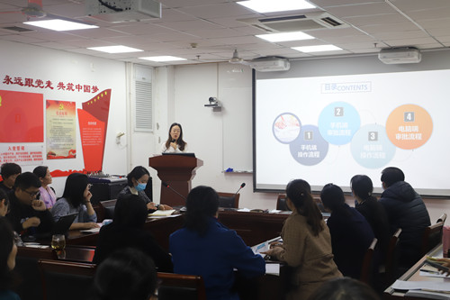 会上,计财处姜晓挺老师分别从手机端和电脑端的日常报销、国内差旅、借款、酬金申报四个部分的智能报销申报流程进行详细的宣讲。随后,程萍副处长从“为什么推行使用智能报账系统”、“使用中注意的细节”给大家开展详实讲解,最后就老师们在使用智能报账中遇到的问题进行现场答疑。
