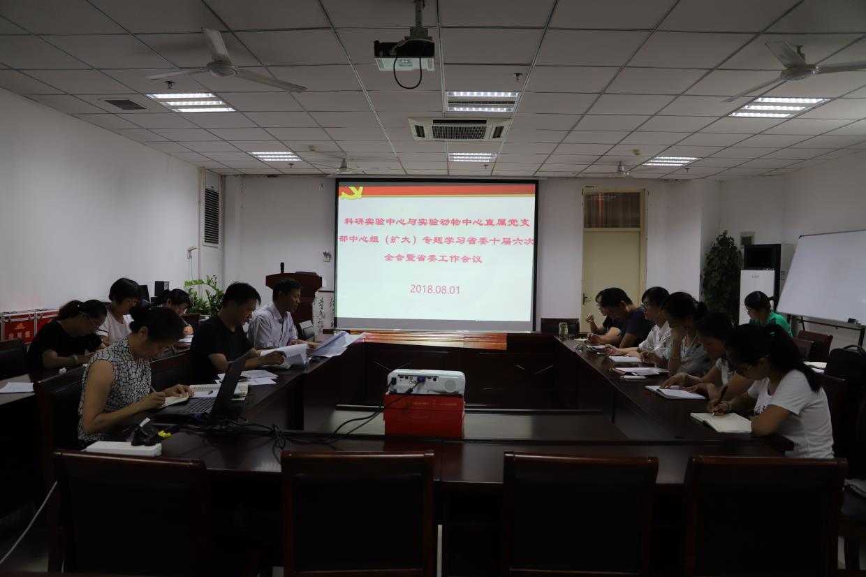 2018年8月1日上午,按照学校党委的安排和部署,科研实验中心与实验动物中心直属党支部中心组(扩大)在教学综合大楼BM739召开会议,集中学习省委十届六次全会暨省委工作会议精神。中心所有处级干部、各党小组组长、各实验室主任以及全体科级干部参加会议。会议由张振强主任主持。