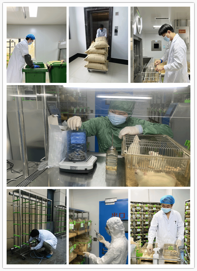 8名值守教职工严格遵守学校防控政策,同时按照日常工作标准认真完成中心现有实验动物的饲养和管理,每天检查每笼每只实验动物的情况,及时更换饮用水、饲料和垫料等。坚持灭菌服、设施的每日清洁和消杀,认真清洗灭菌水瓶、笼盒和笼架等,及时备足实验动物所需饲料垫料和消杀所需的酒精、新洁尔灭等试剂,协助课题组完成行为学、解剖取材等实验,保障在中心的研究课题顺利进行。