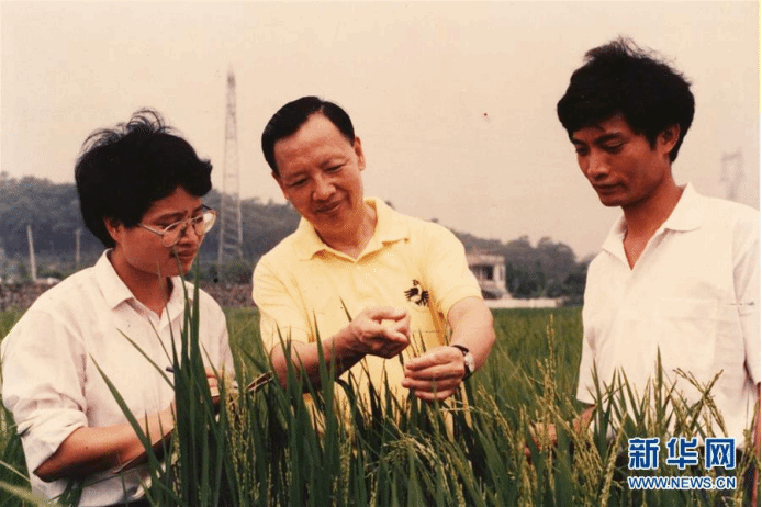 卢永根(中)在水稻试验地指导博士研究生(资料照片)。新华社发(华南农业大学供图)